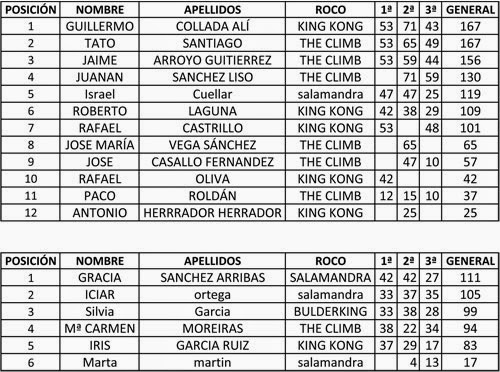 Clasificación 2ª prueba #5MBT 2017 - Indoorwall Griñón
