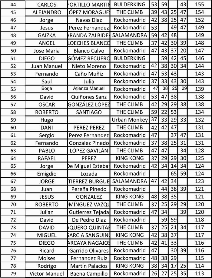 Clasificación 3ª prueba #5MBT 2017 - Boulder Madrid